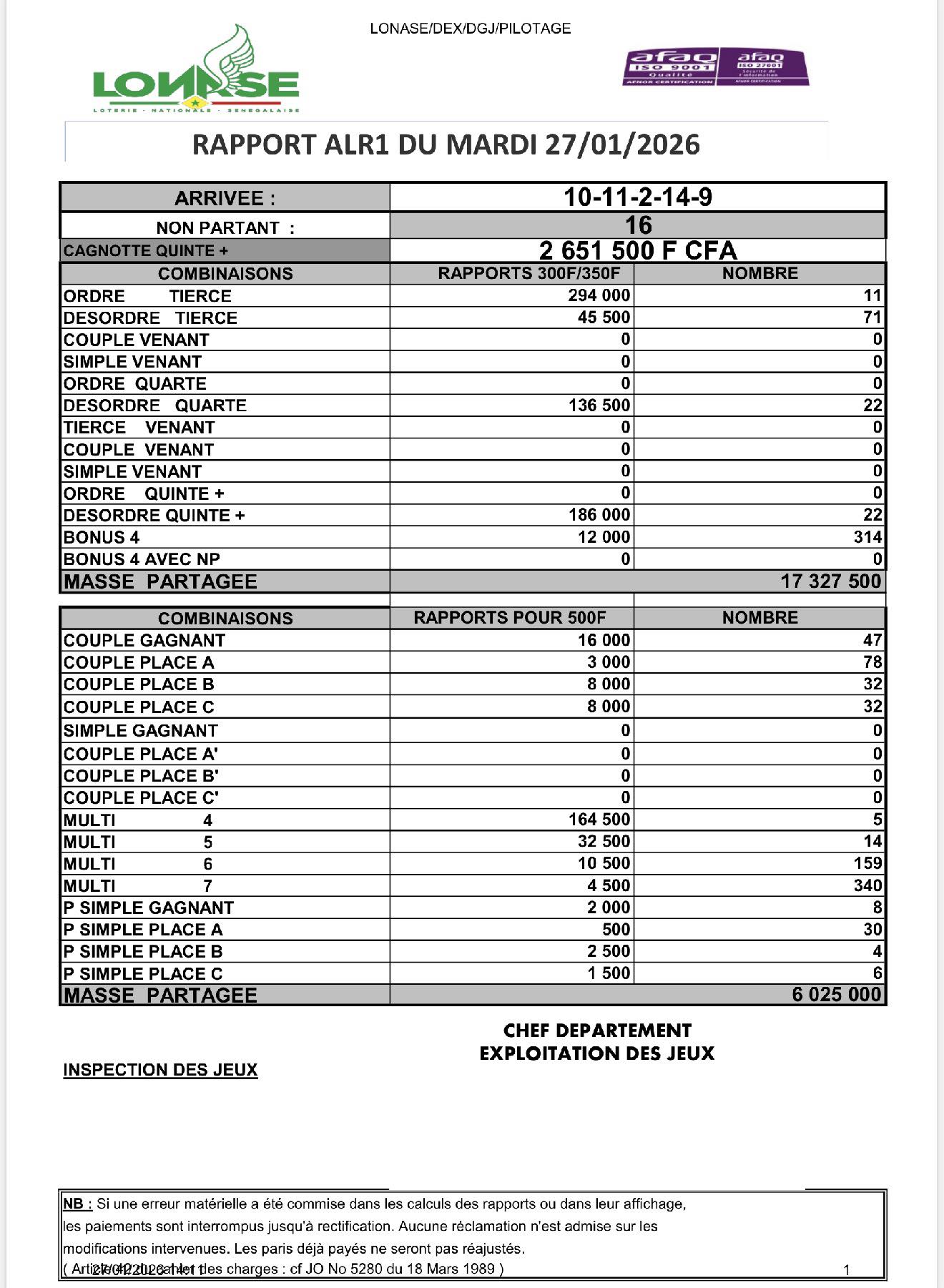 Arrivé, gain, programme et pronostic de alr1 du jour 27-01-2026 LONASE