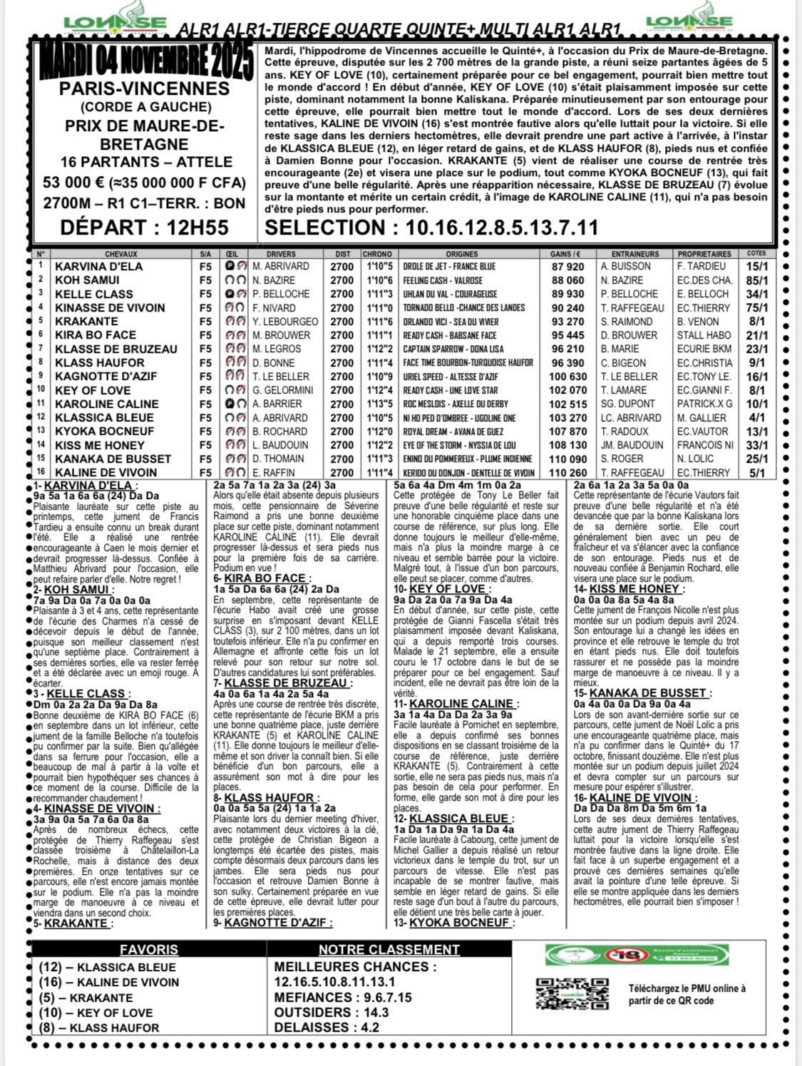 Arrivé, gain, programme et pronostic de alr1 du jour 04-11-2025 LONASE