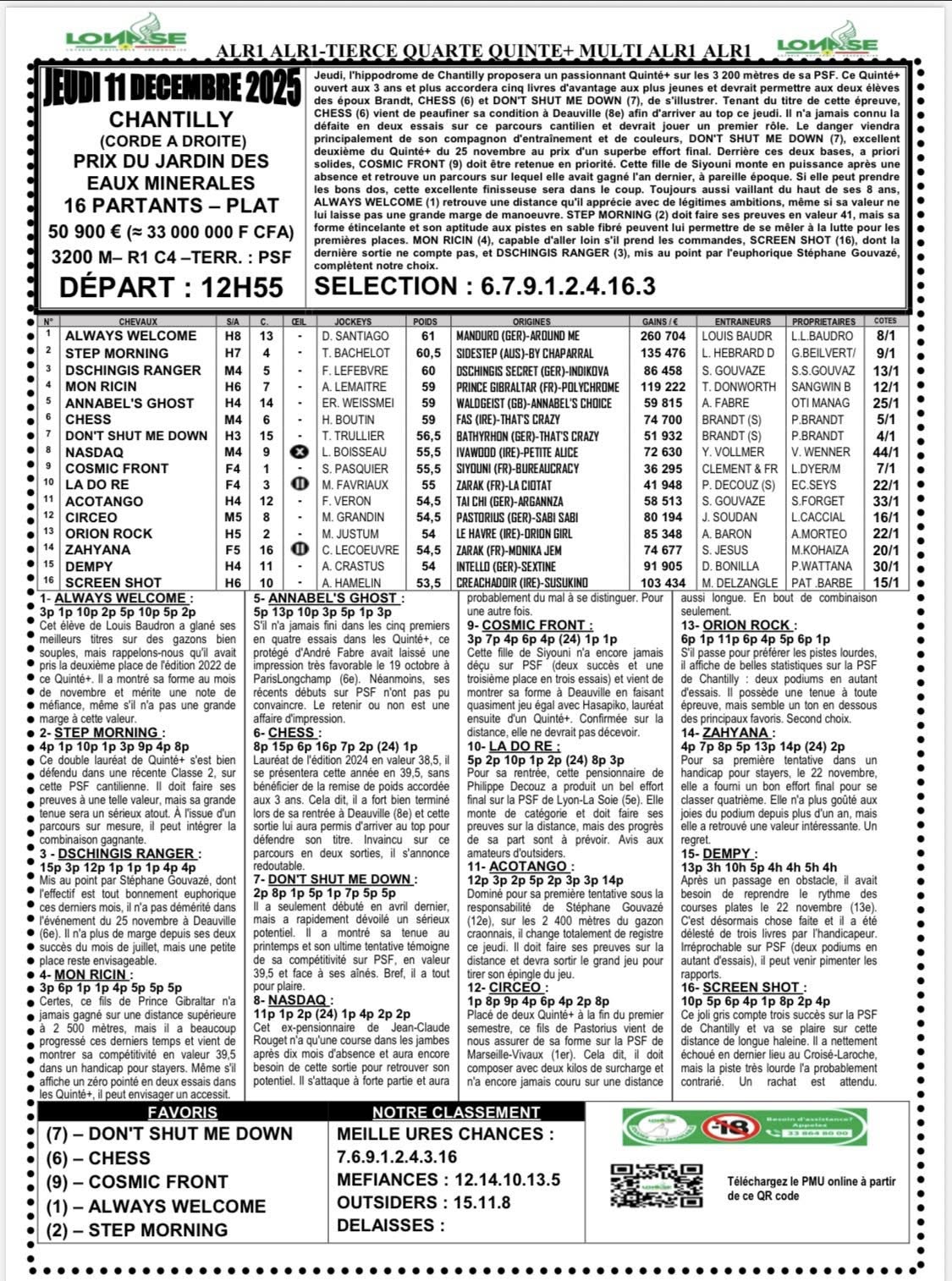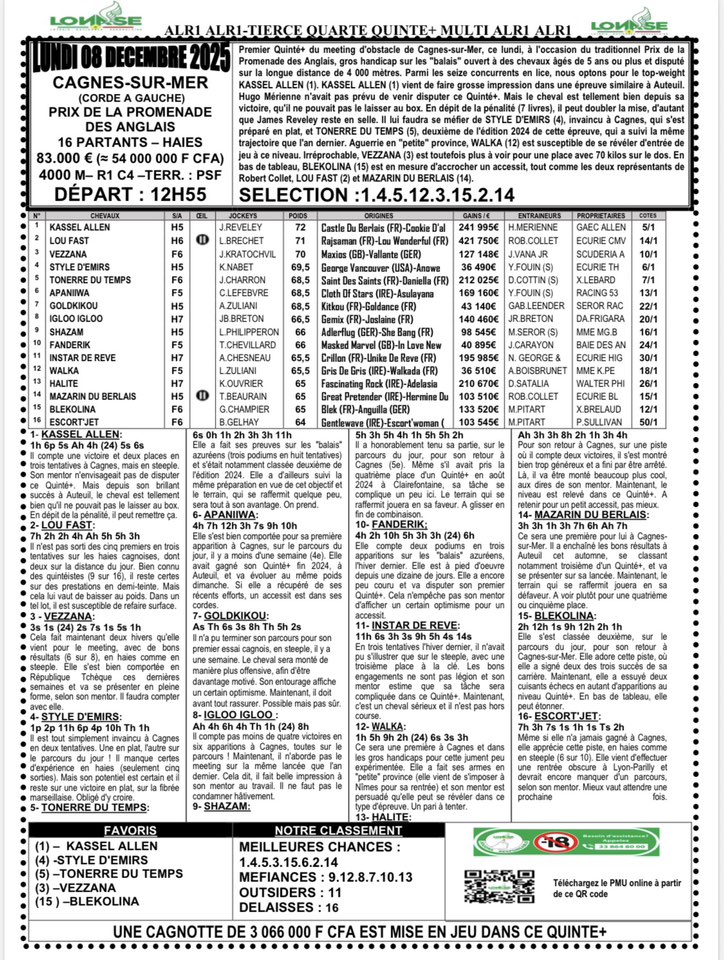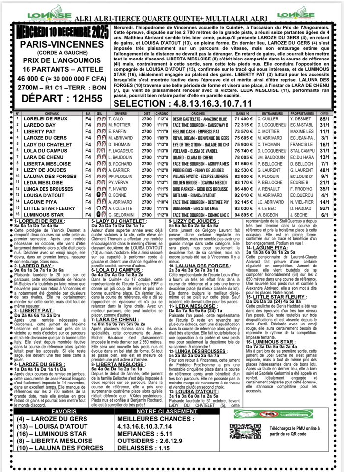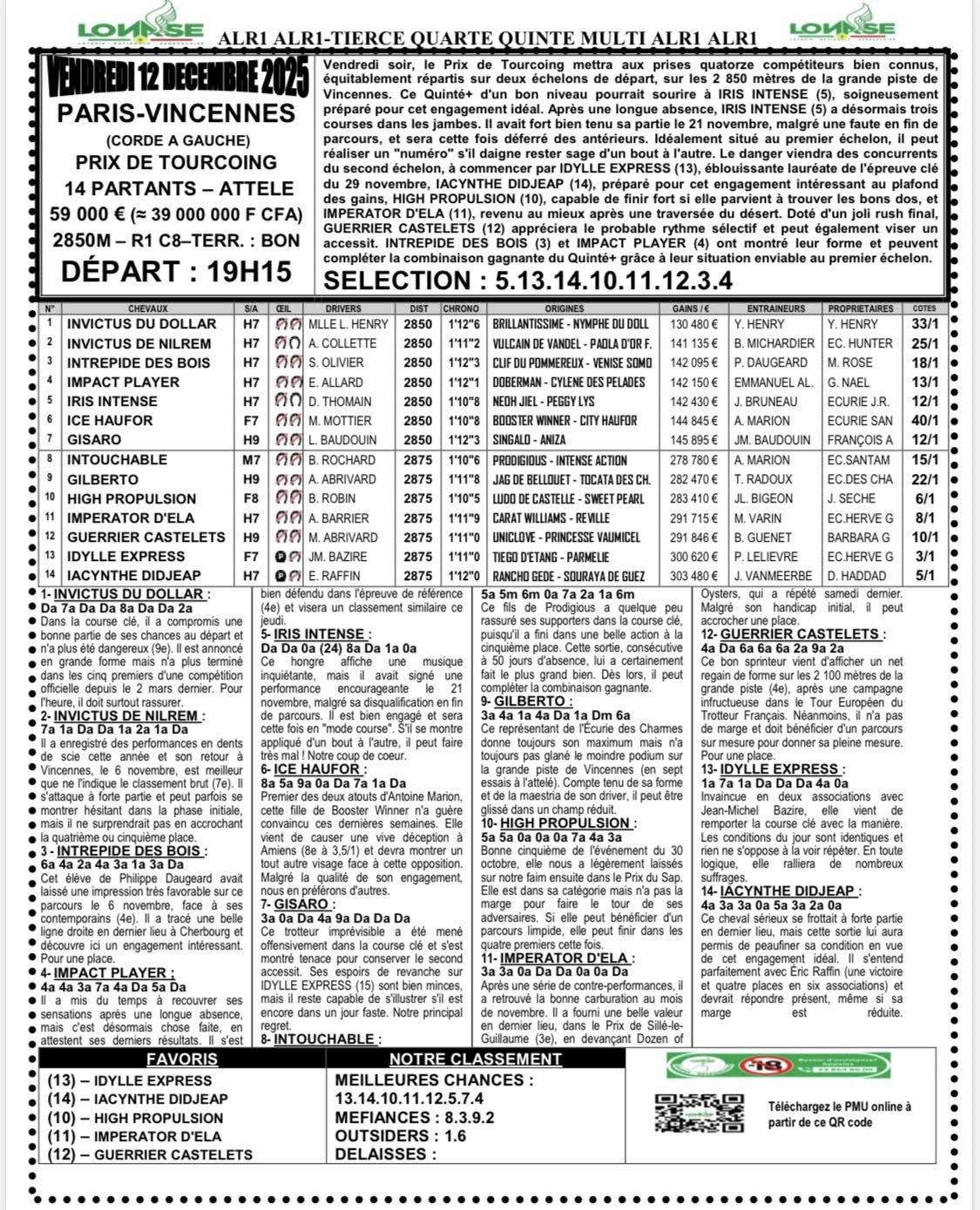 Arrivé, gain, programme et pronostic de alr1 du jour 12-12-2025 LONASE