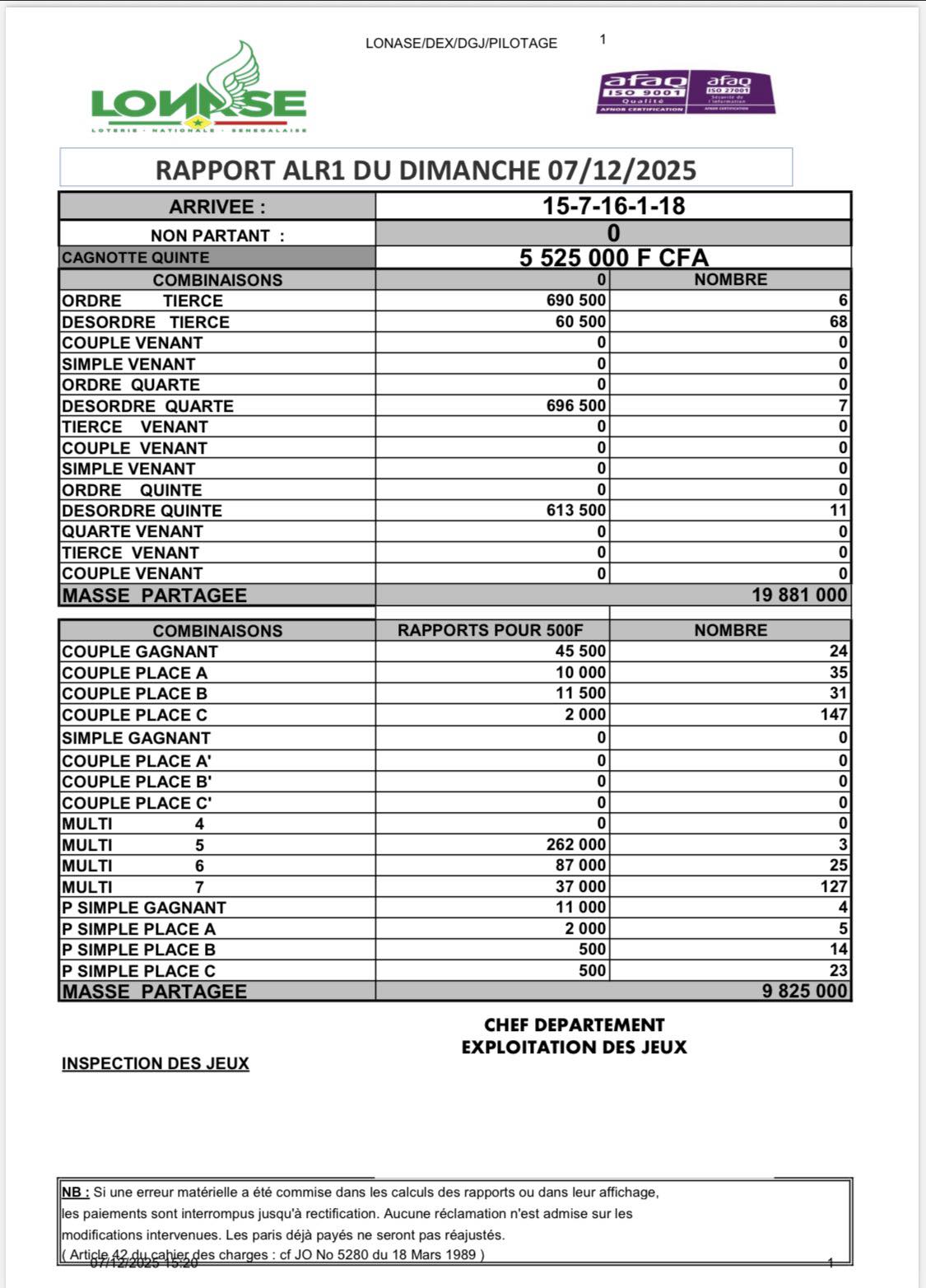| ARRIVEE ALR1 DU 07-12-2025 : 15 - 7 - 16 - 1 - 18 cliquer ici pour voir les gains | |
