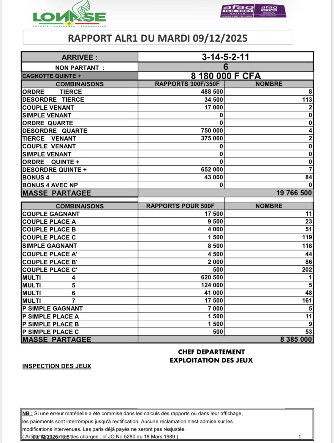 | ARRIVEE ALR1 DU 11-12-2025 : 14 - 15 - 4 - 2 - 1 cliquer ici pour voir les gains | |