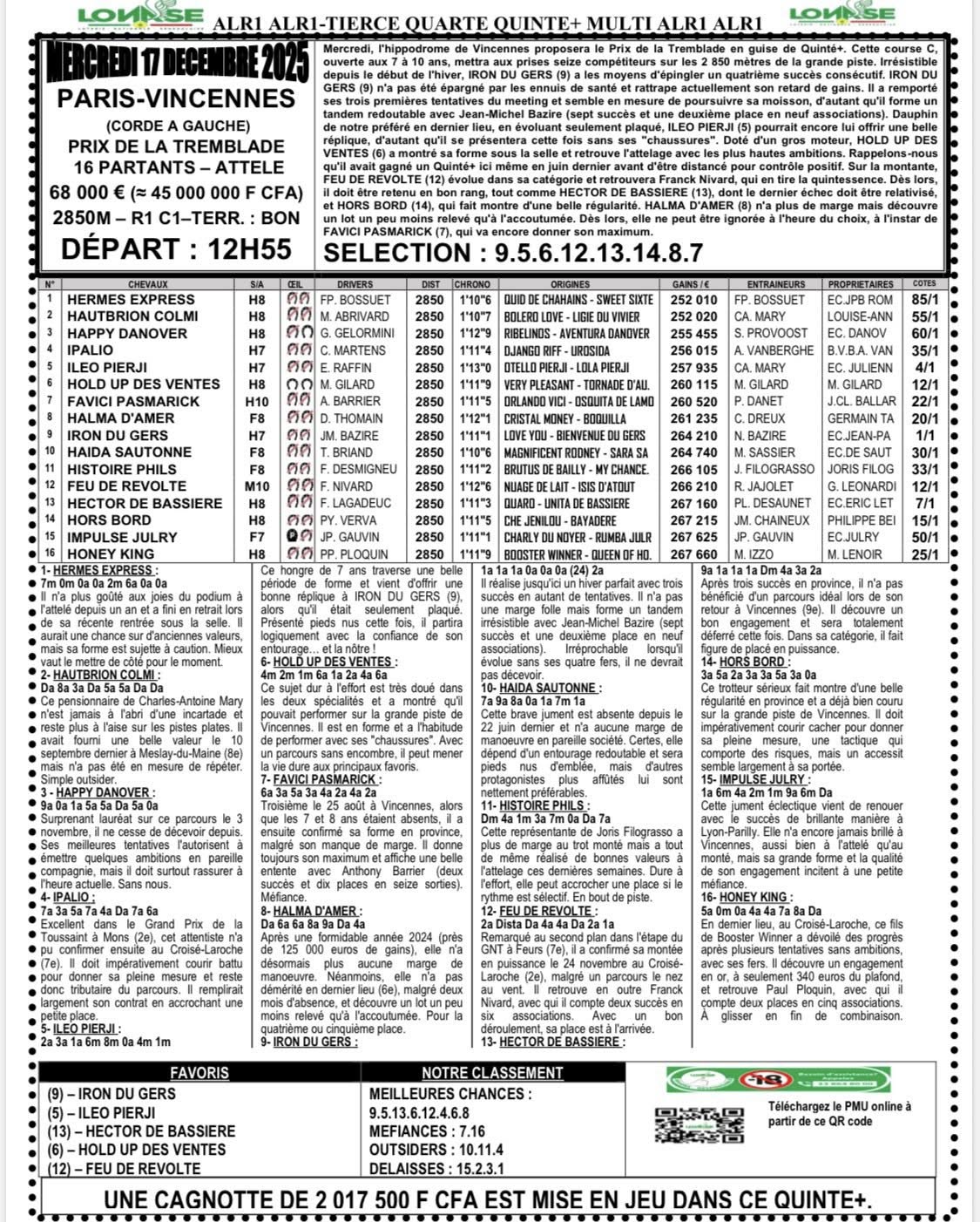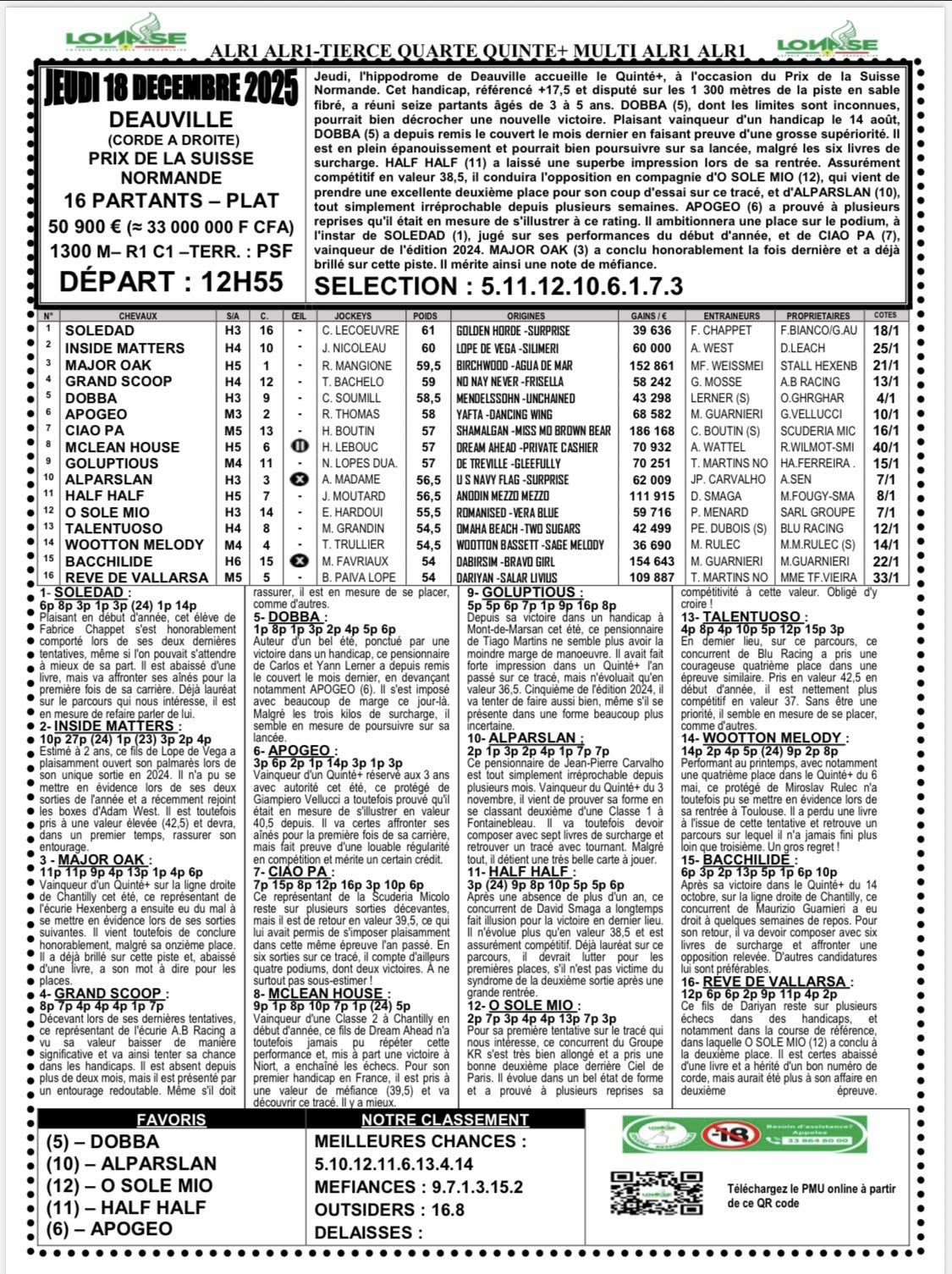 Arrivé, gain, programme et pronostic de alr1 du jour 18-12-2025 LONASE