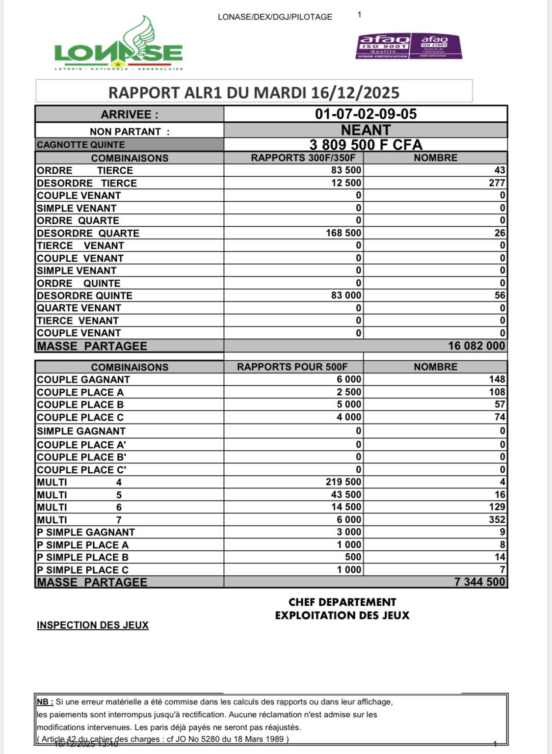 | ARRIVEE ALR1 DU 16-12-2025 : 1 - 7 - 2 - 9 - 5 cliquer ici pour voir les gains | |