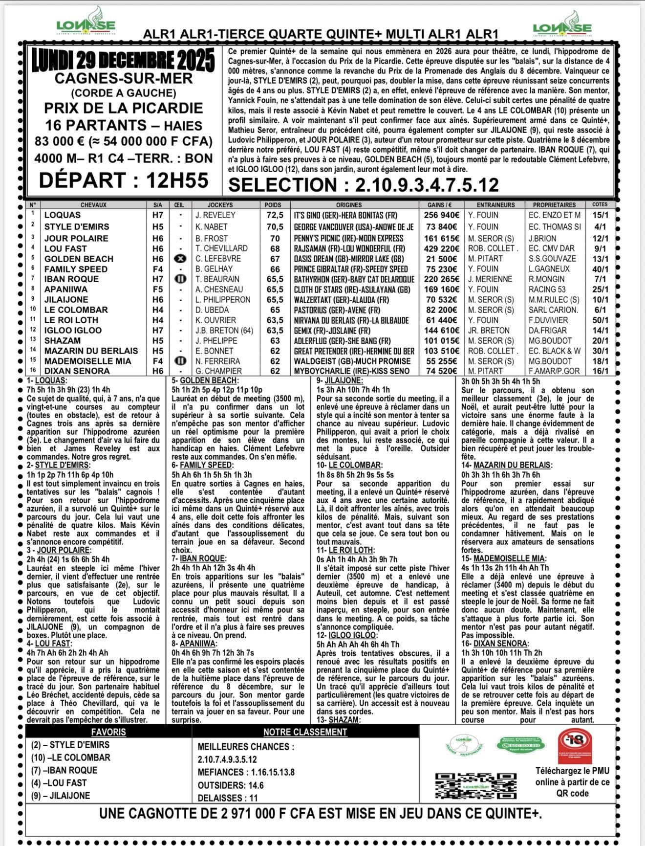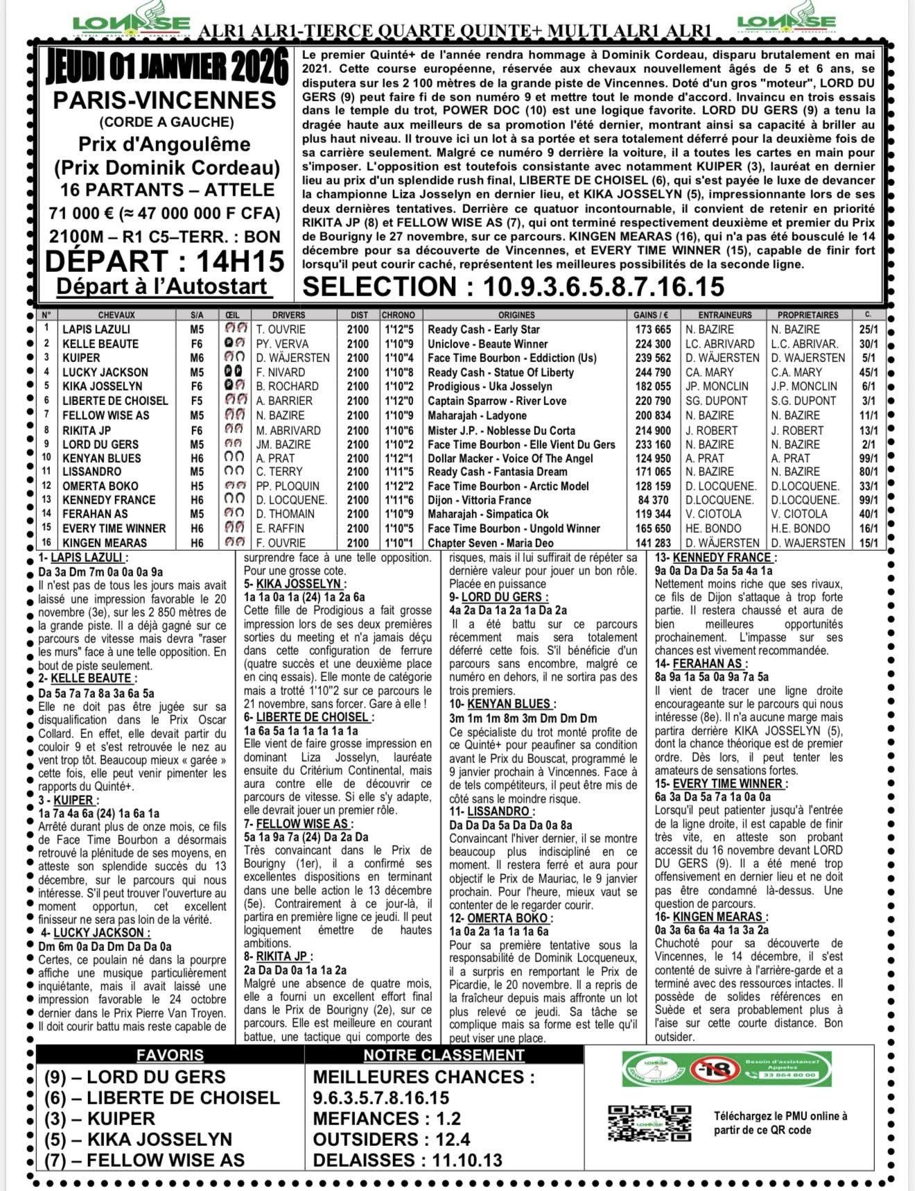 Arrivé, gain, programme et pronostic de alr1 du jour 01-01-2026 LONASE
