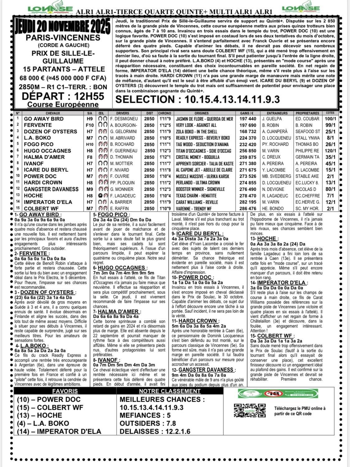 | ARRIVEE ALR1 DU 20-11-2025 : 10 - 15 - 14 - 3 - 9 cliquer ici pour voir les gains | |