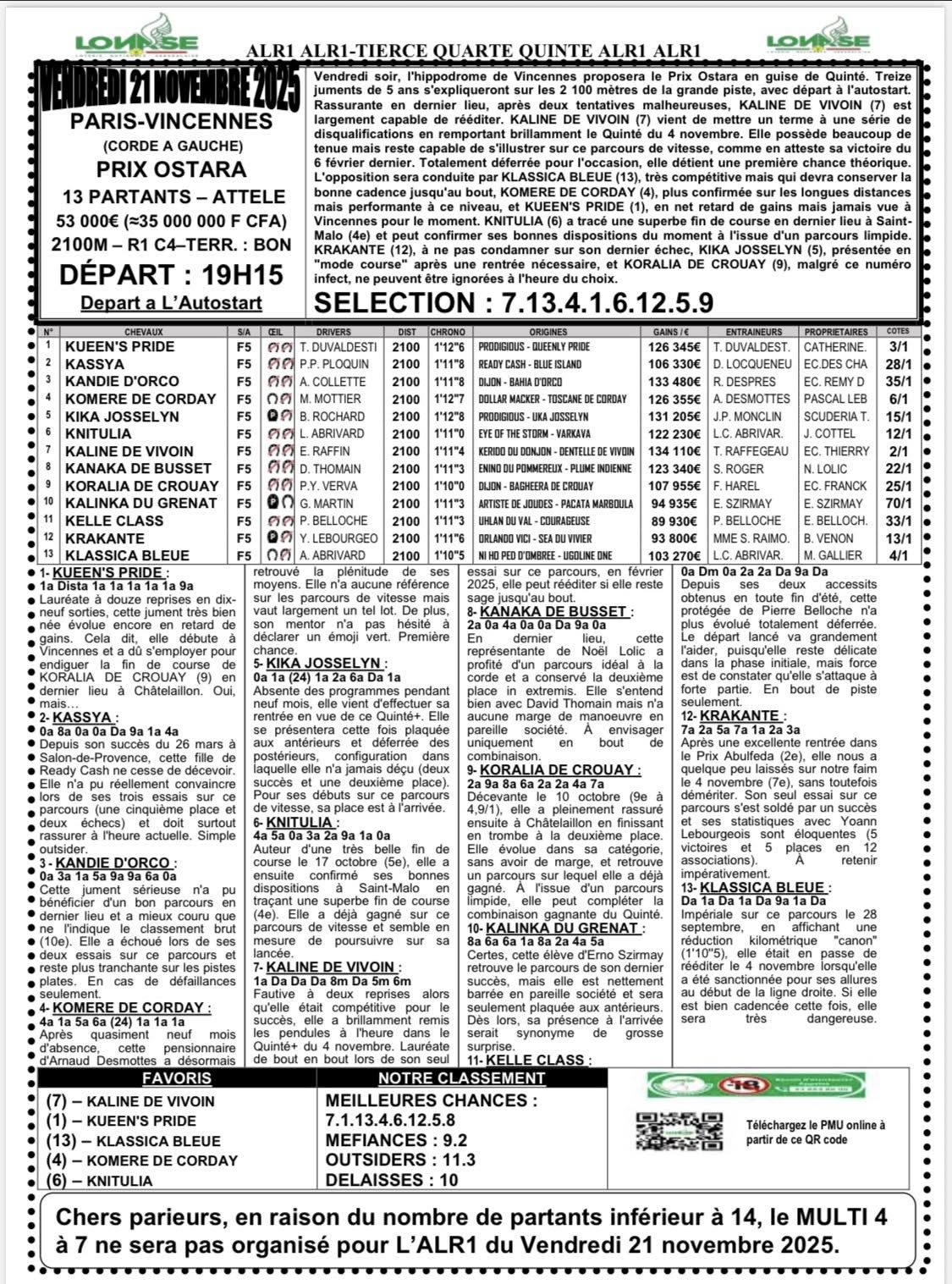 Arrivé, gain, programme et pronostic de alr1 du jour 21-11-2025 LONASE