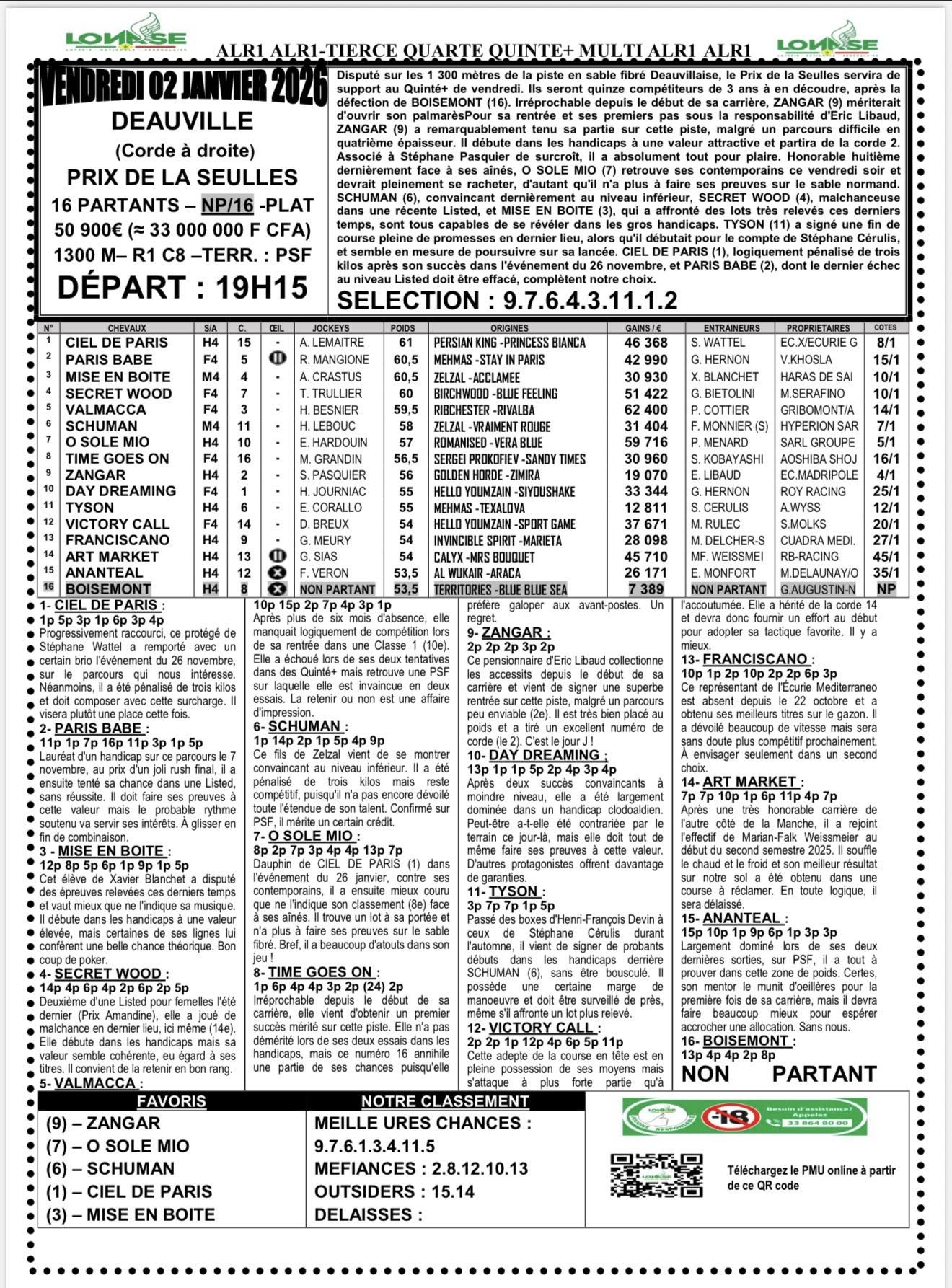 Arrivé, gain, programme et pronostic de alr1 du jour 02-01-2026 LONASE