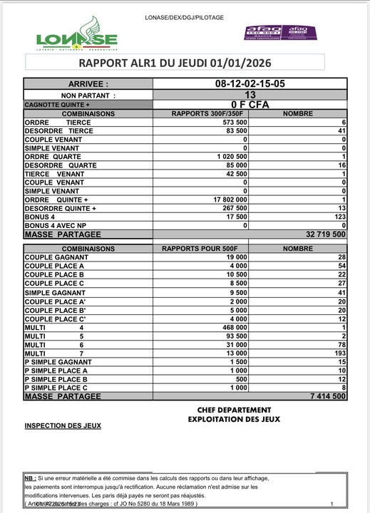 | ARRIVEE ALR1 DU 01-01-2026 : 8 - 12 - 2 - 15 - 5 cliquer ici pour voir les gains | |