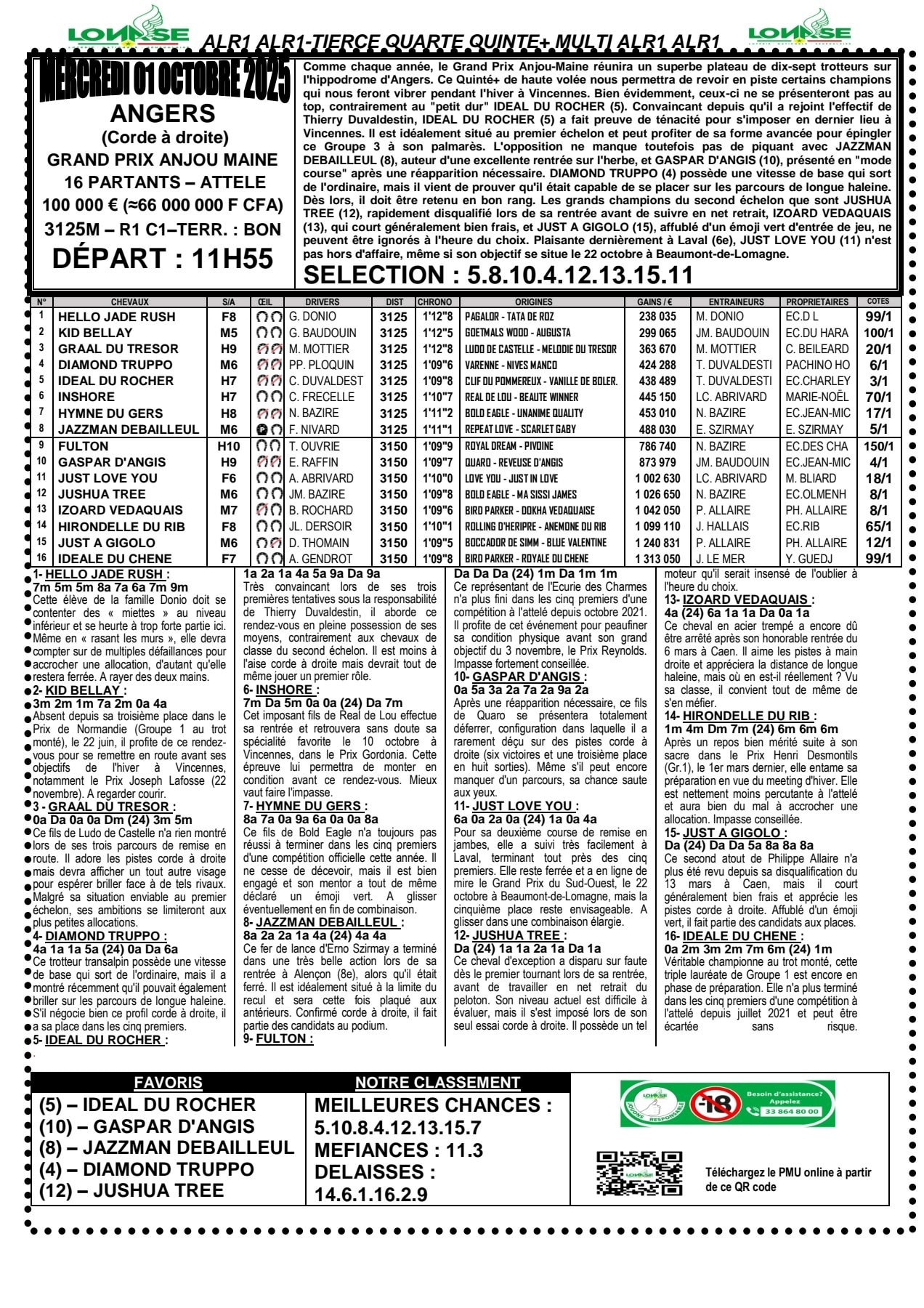 ARRIVEE ALR1 DU 01-10-2025 : 7 - 13 - 3 - 4 - 5 cliquer ici pour voir les gains | |