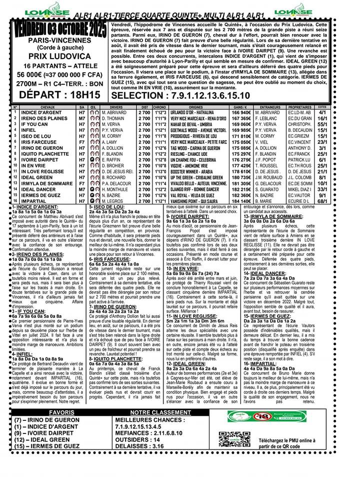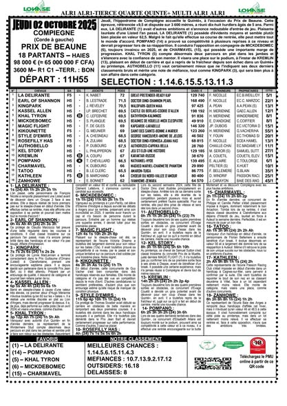 Arrivé, gain, programme et pronostic de alr1 du jour 03-10-2025 LONASE