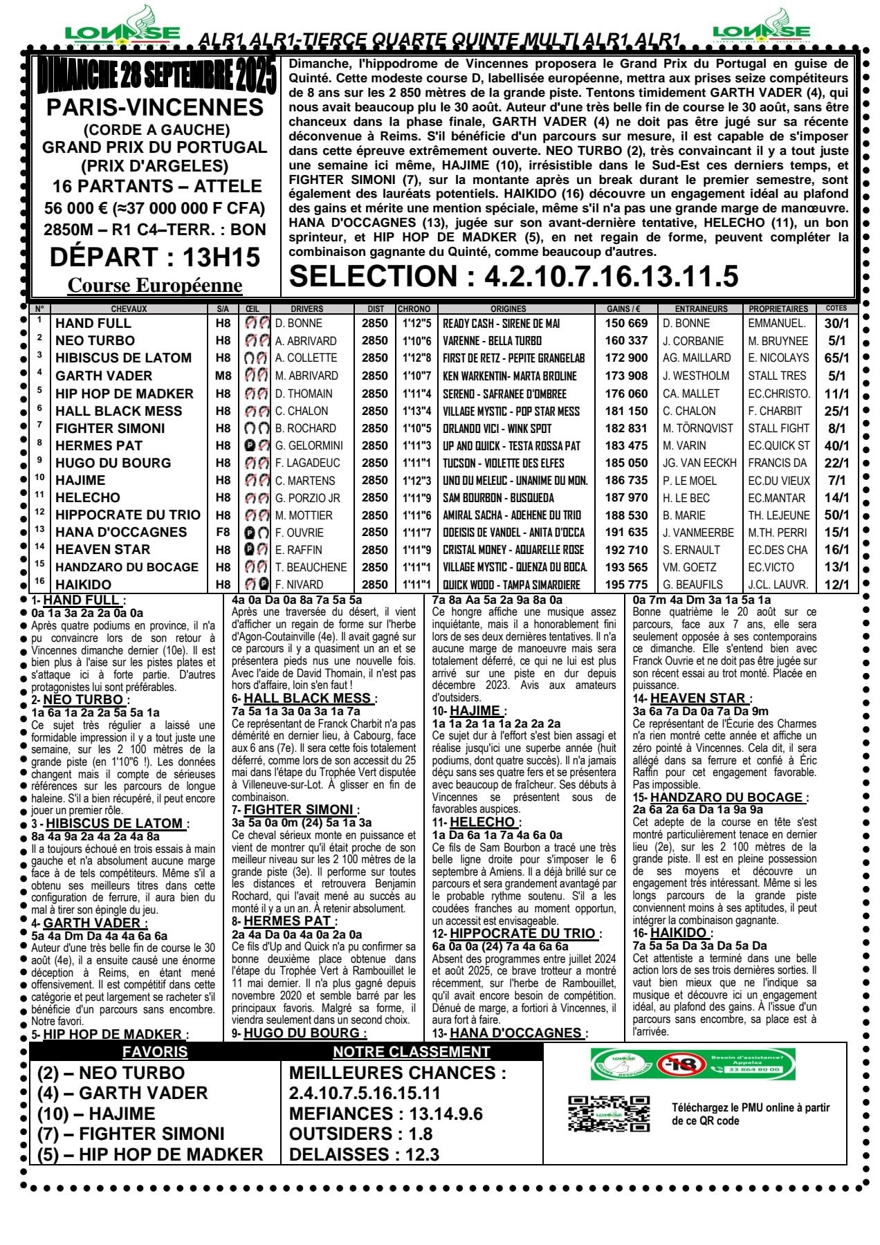 ARRIVEE ALR1 DU 27-09-2025 : 12 - 5 - 7 - 15 - 3 cliquer ici pour voir les gains | |