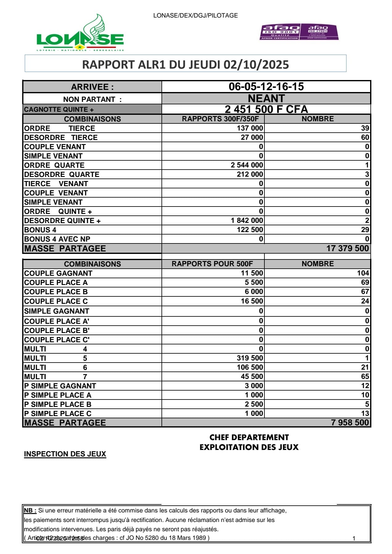 ARRIVEE ALR1 DU 02-10-2025 : 6 - 5 - 12 - 16 - 15 cliquer ici pour voir les gains | |