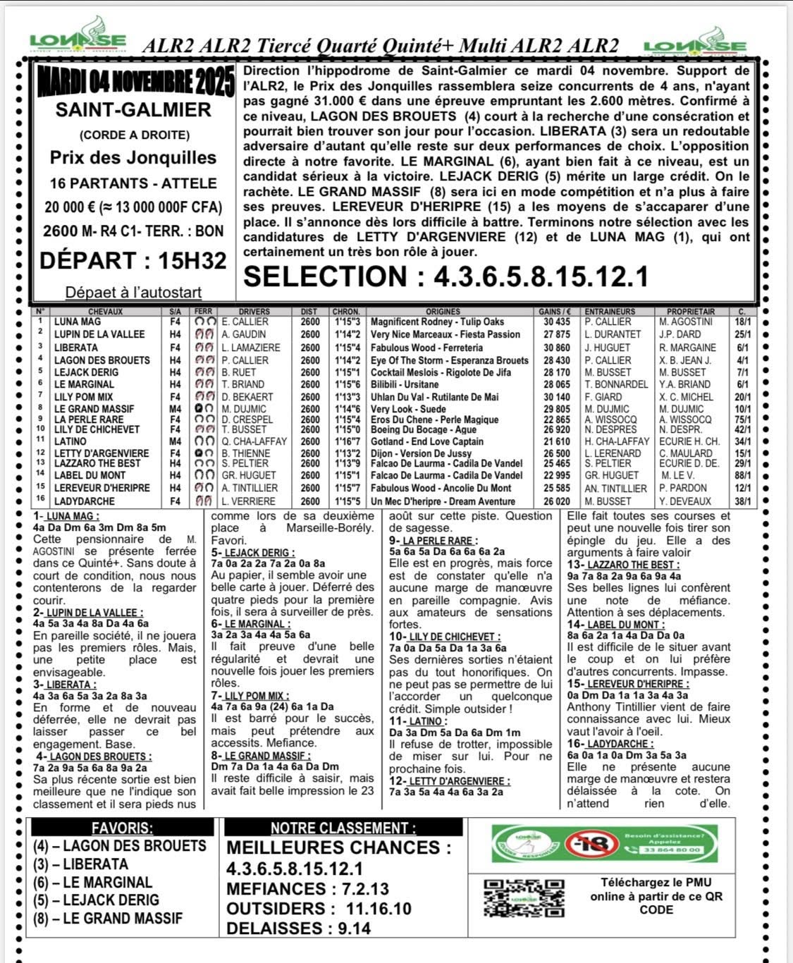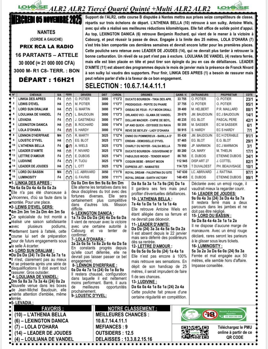 Arrivé, gain, programme et pronostic de alr2 du jour 06-11-2025 LONASE