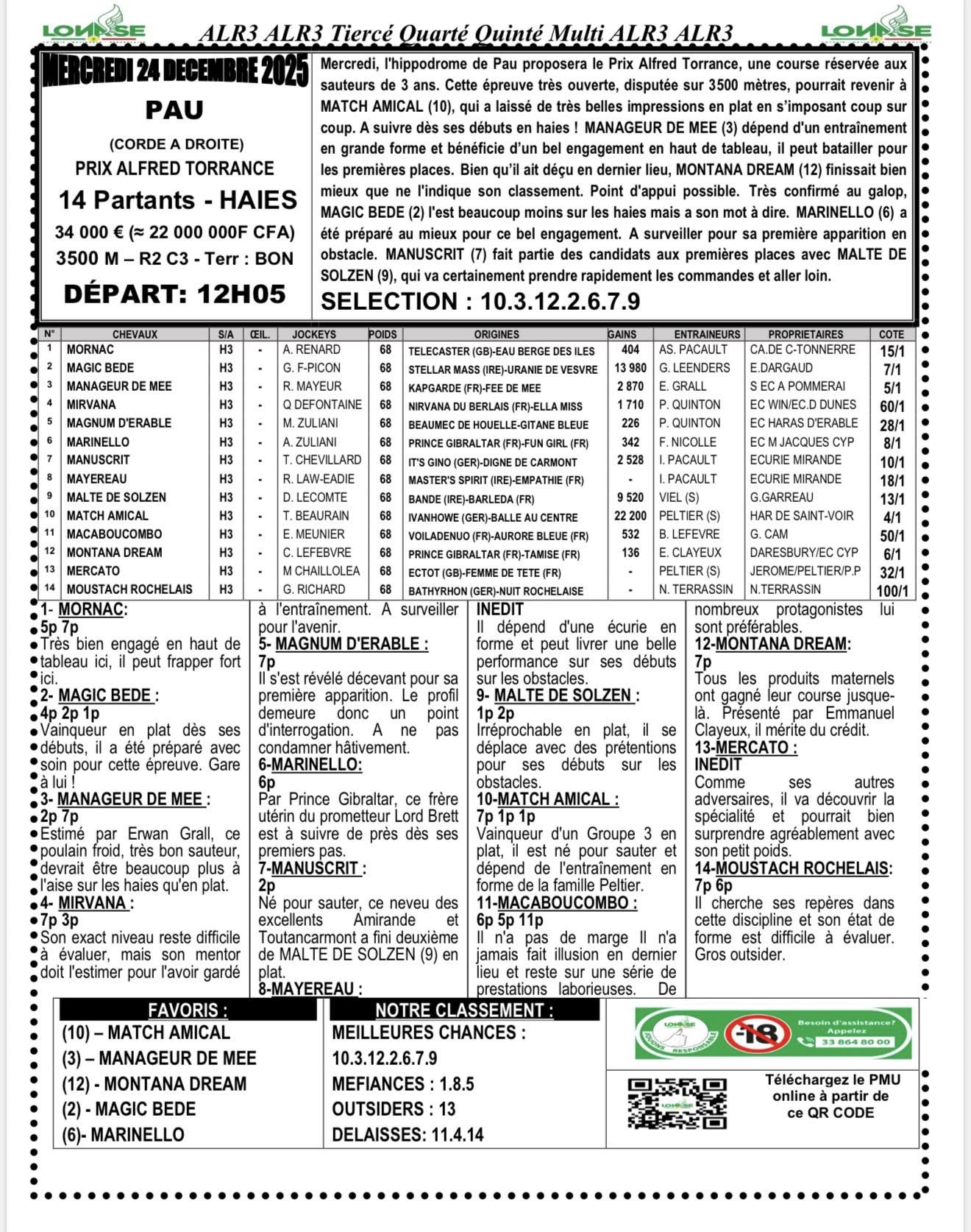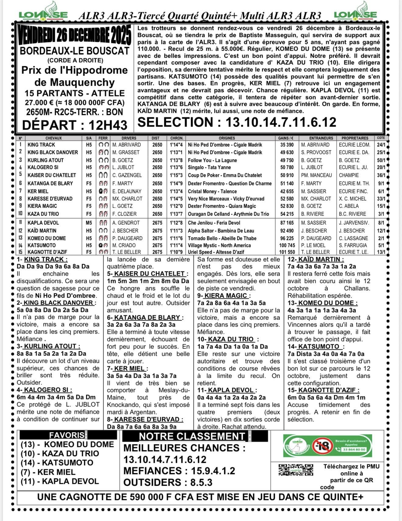 Arrivé, gain, programme et pronostic de alr3 du jour 26-12-2025 LONASE