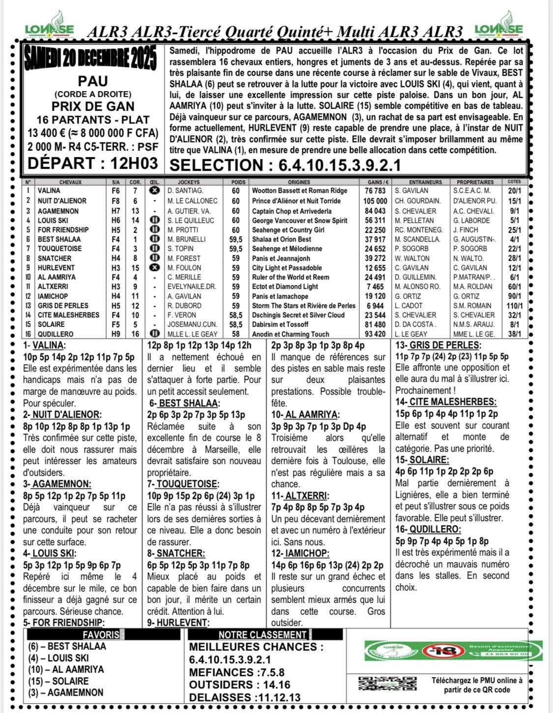 Arrivé, gain, programme et pronostic de alr3 du jour 22-12-2025 LONASE