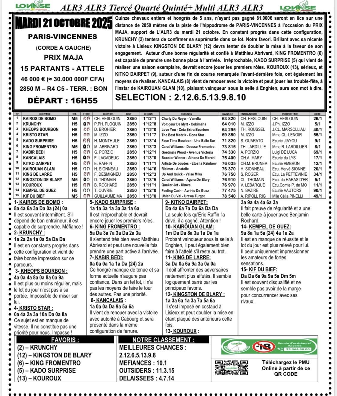 Arrivé, gain, programme et pronostic de alr3 du jour 21-10-2025 LONASE