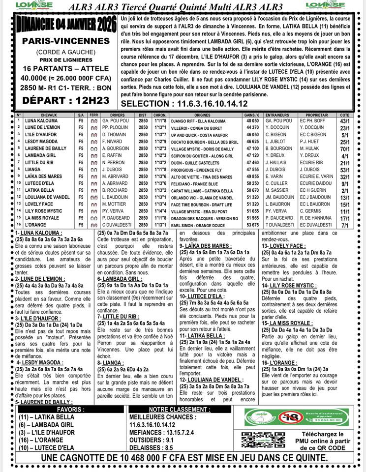 Arrivé, gain, programme et pronostic de alr3 du jour 05-01-2026 LONASE