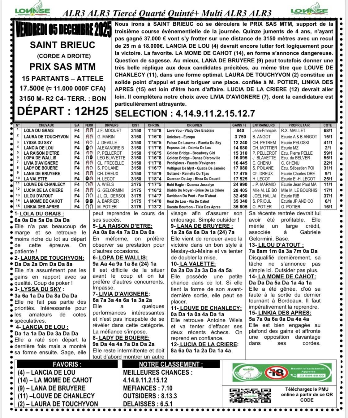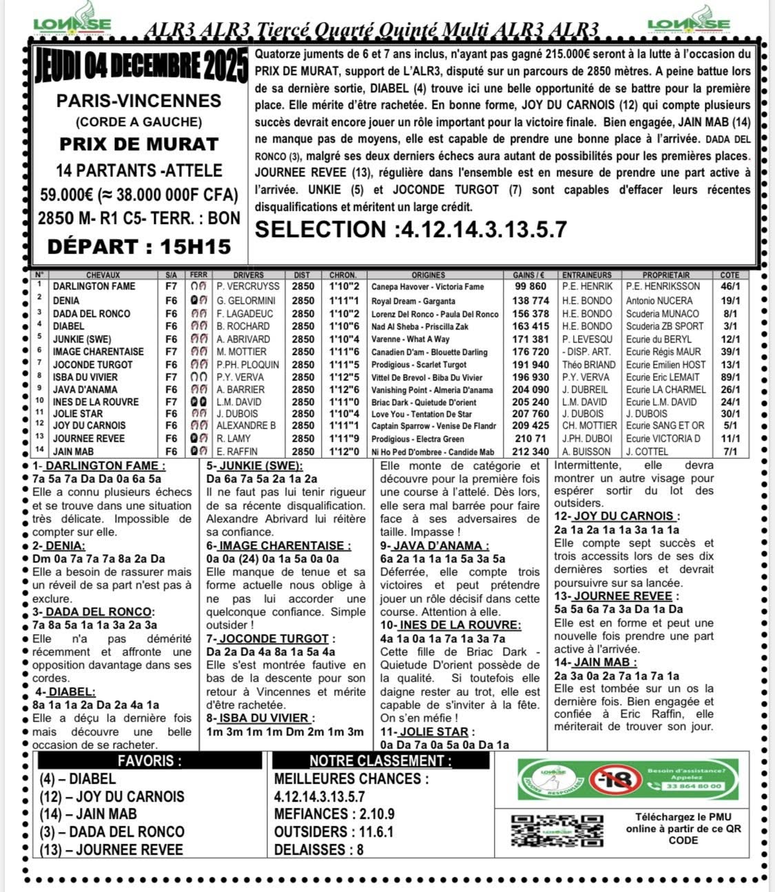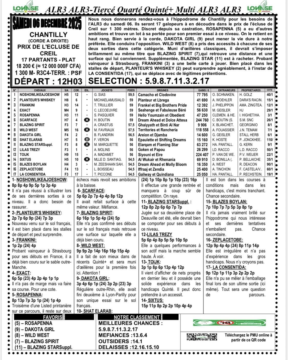 Arrivé, gain, programme et pronostic de alr3 du jour 06-12-2025 LONASE