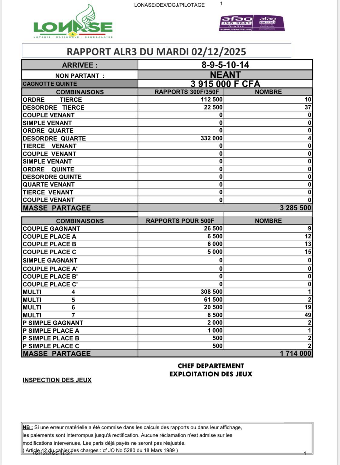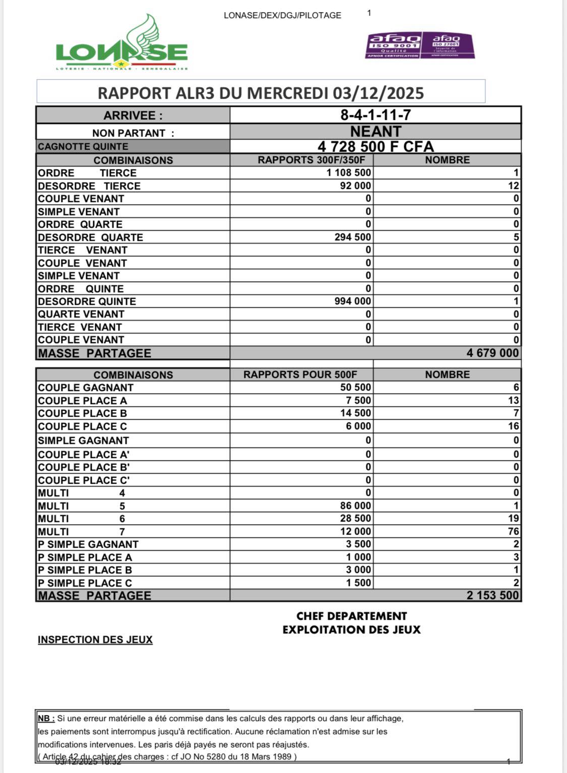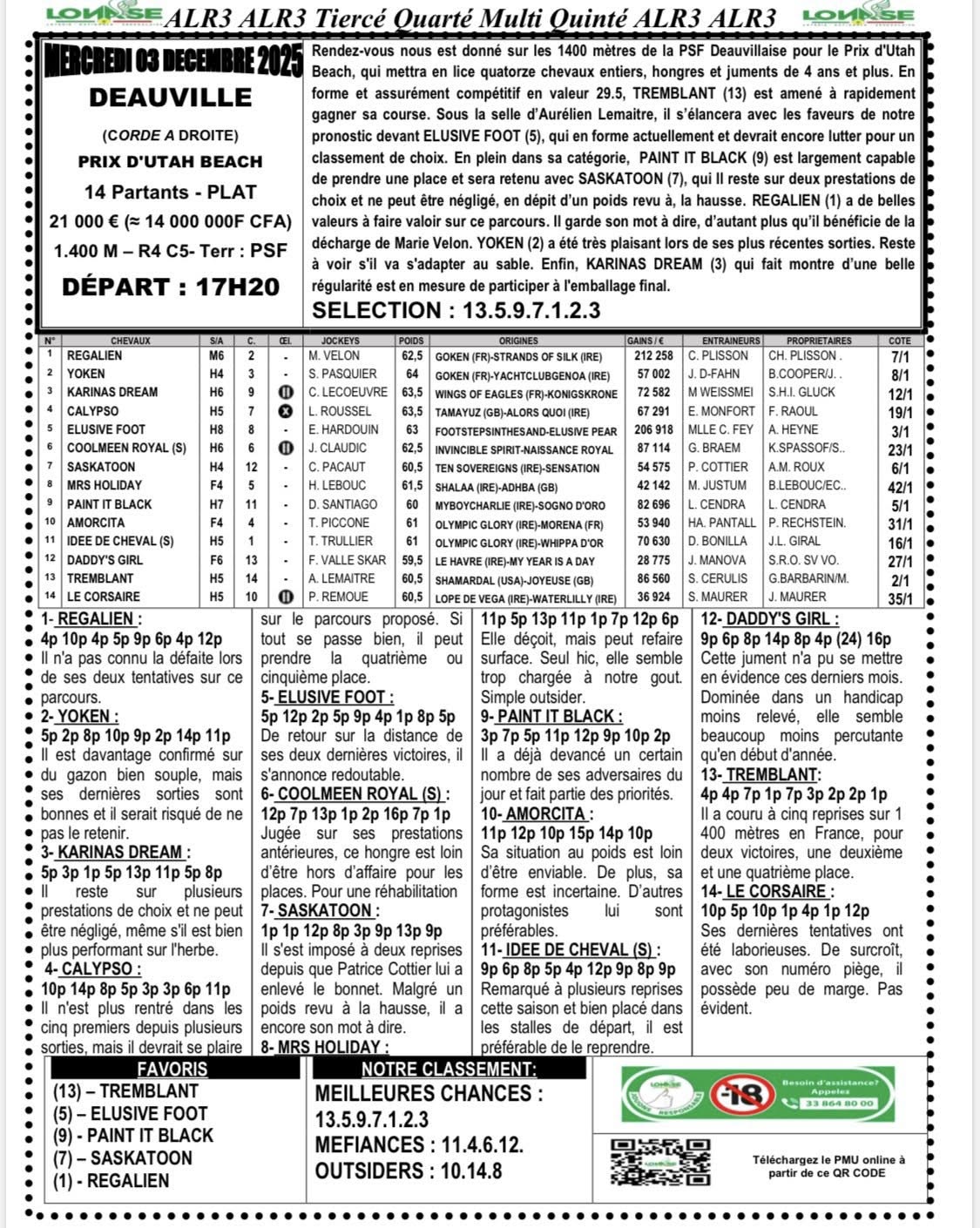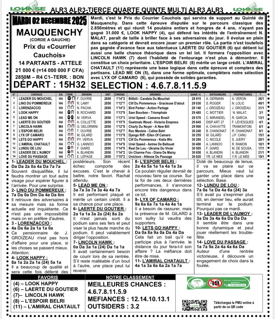 Arrivé, gain, programme et pronostic de alr3 du jour 06-12-2025 LONASE