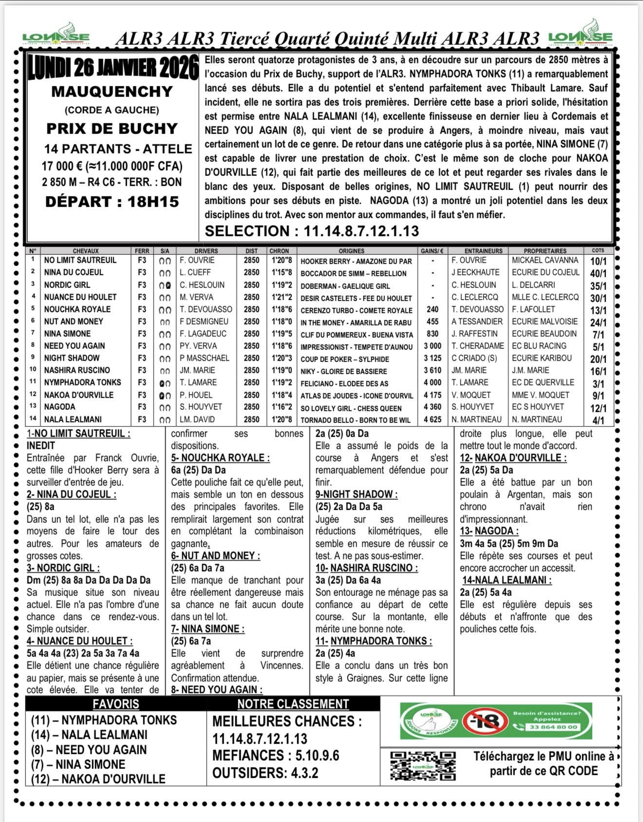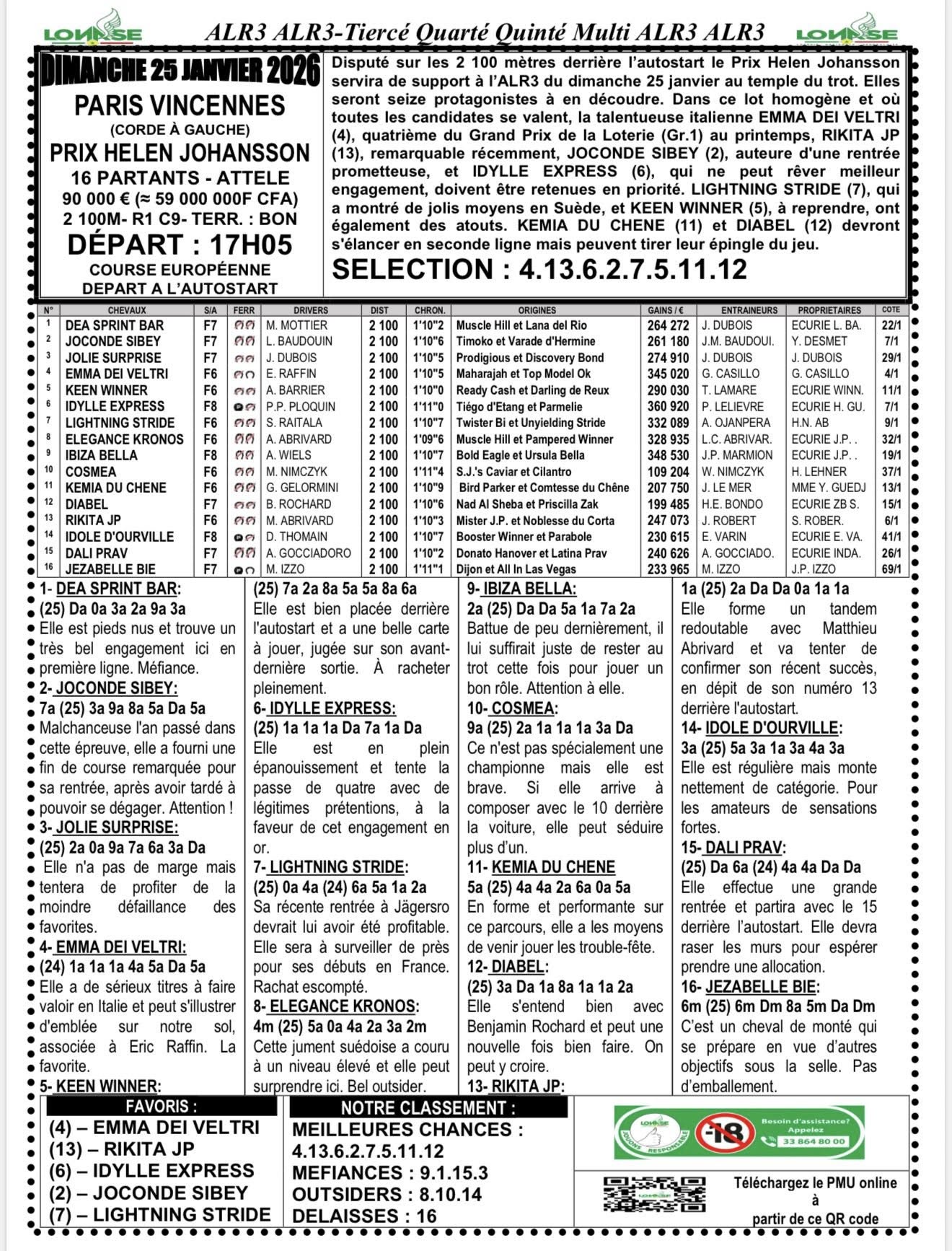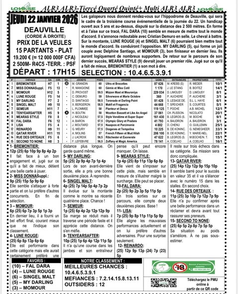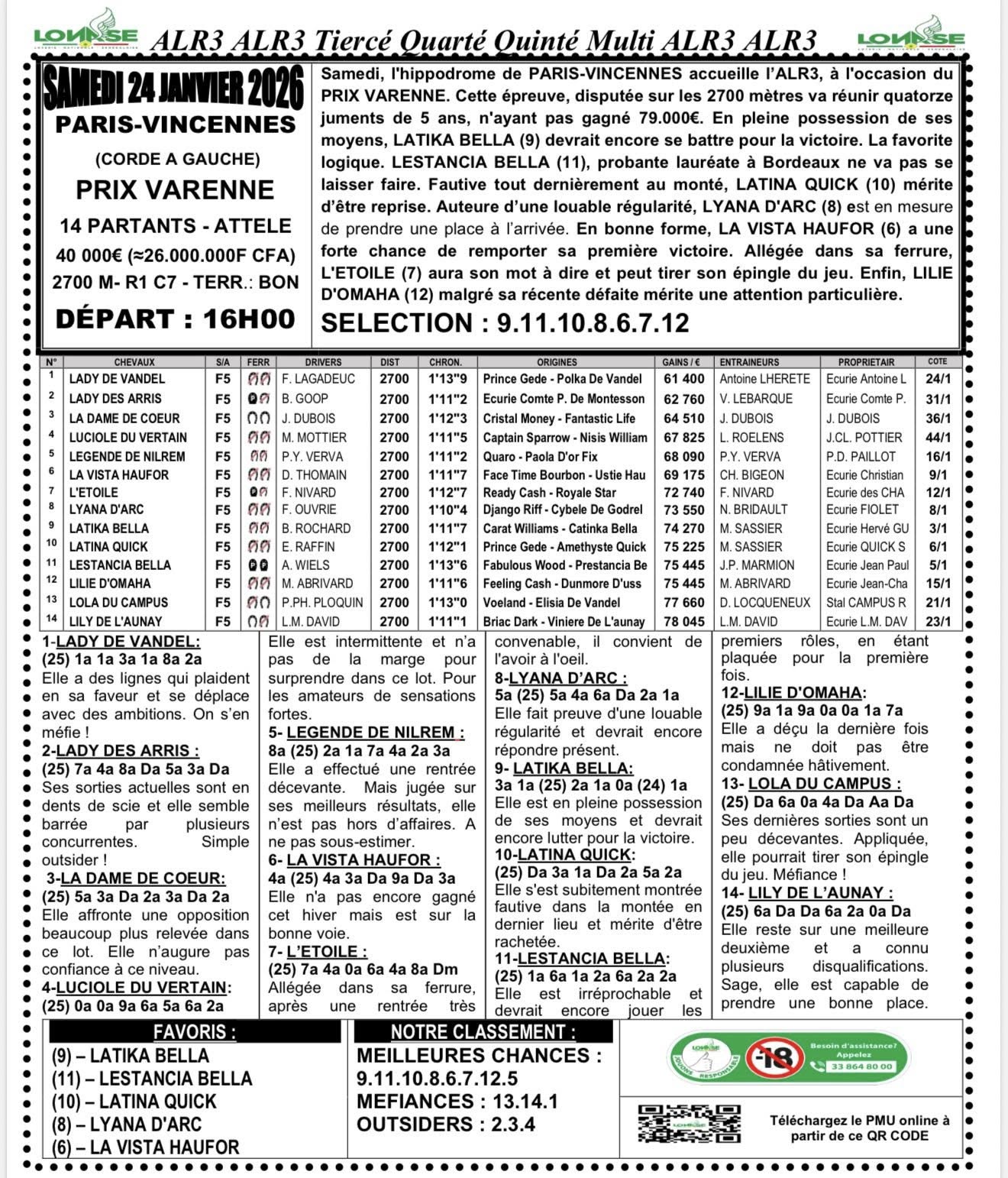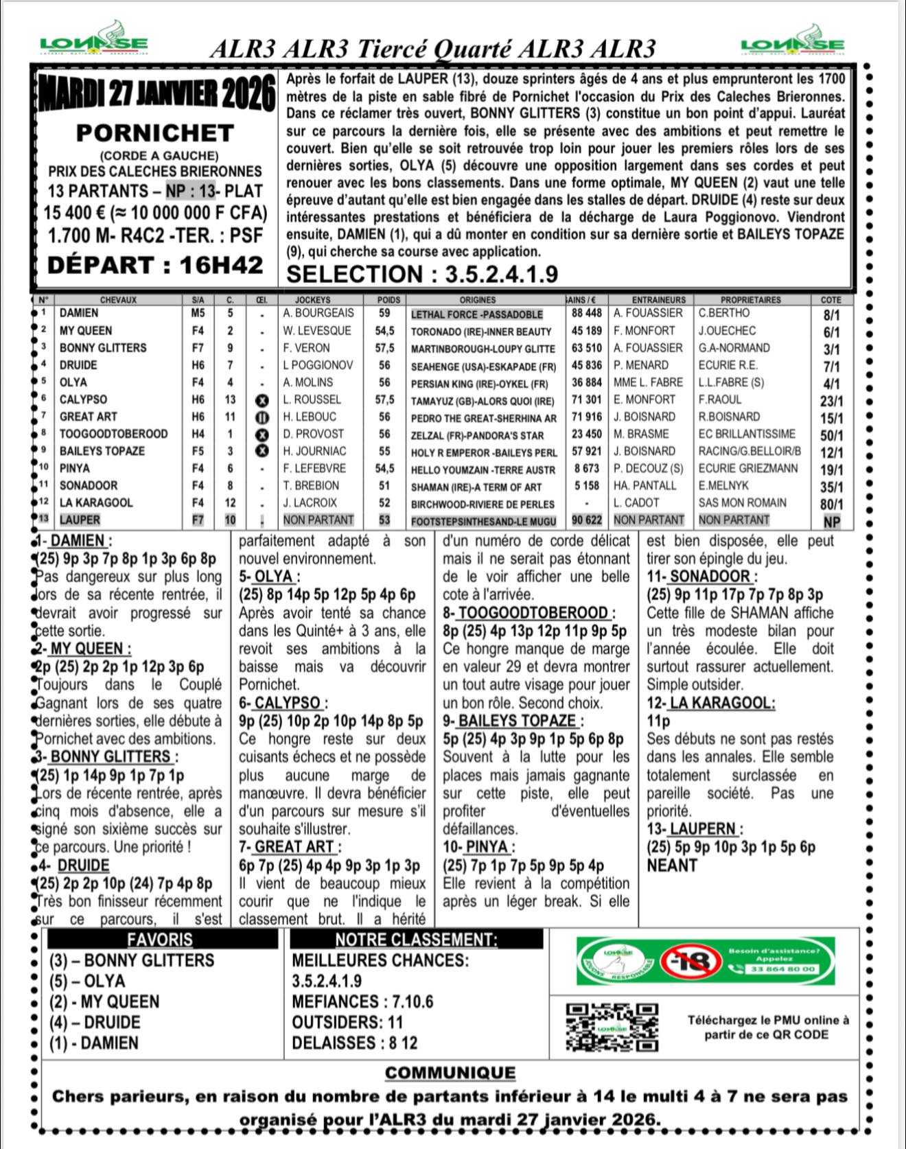 Arrivé, gain, programme et pronostic de alr3 du jour 27-01-2026 LONASE