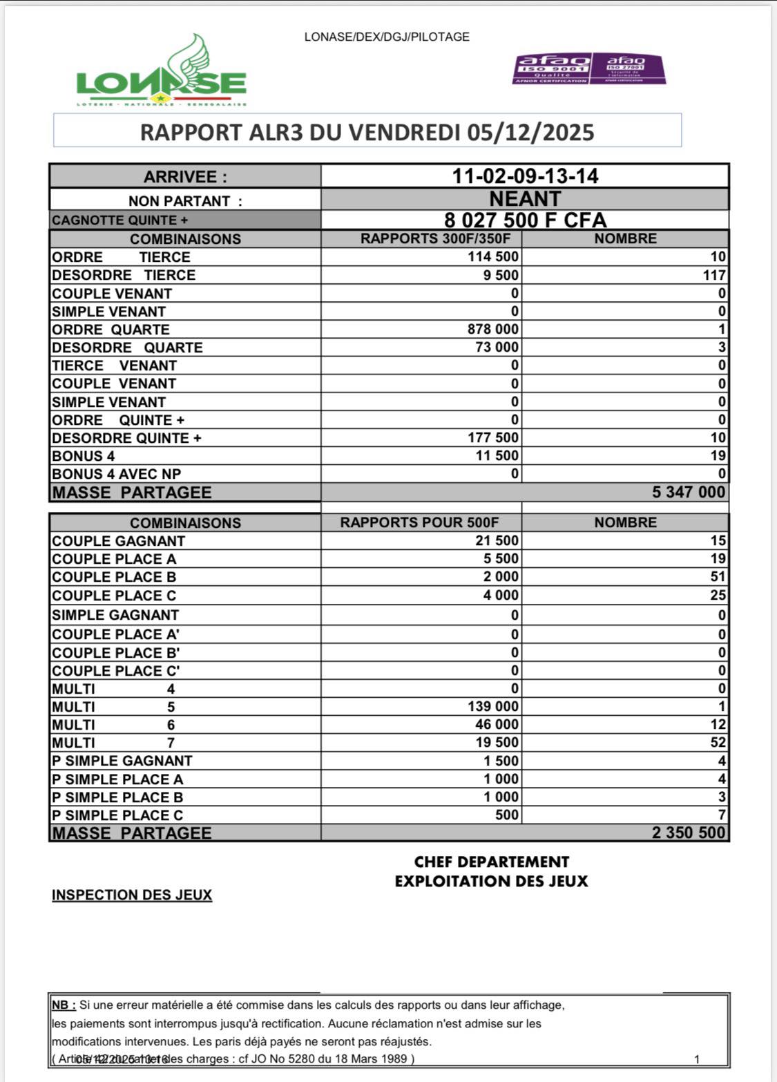 | ARRIVEE ALR3 DU 05-12-2025 : 11-2-9-13-14 cliquer ici pour voir les gains | |