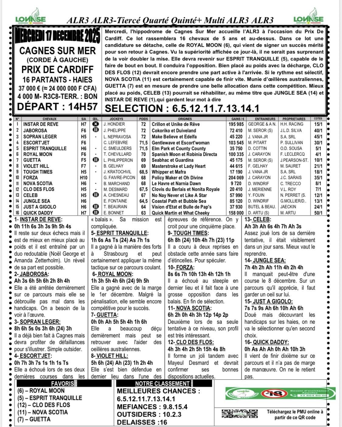 Arrivé, gain, programme et pronostic de alr3 du jour 16-12-2025 LONASE