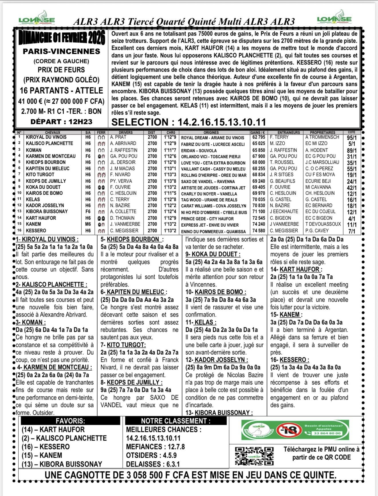 Arrivé, gain, programme et pronostic de alr3 du jour 30-01-2026 LONASE