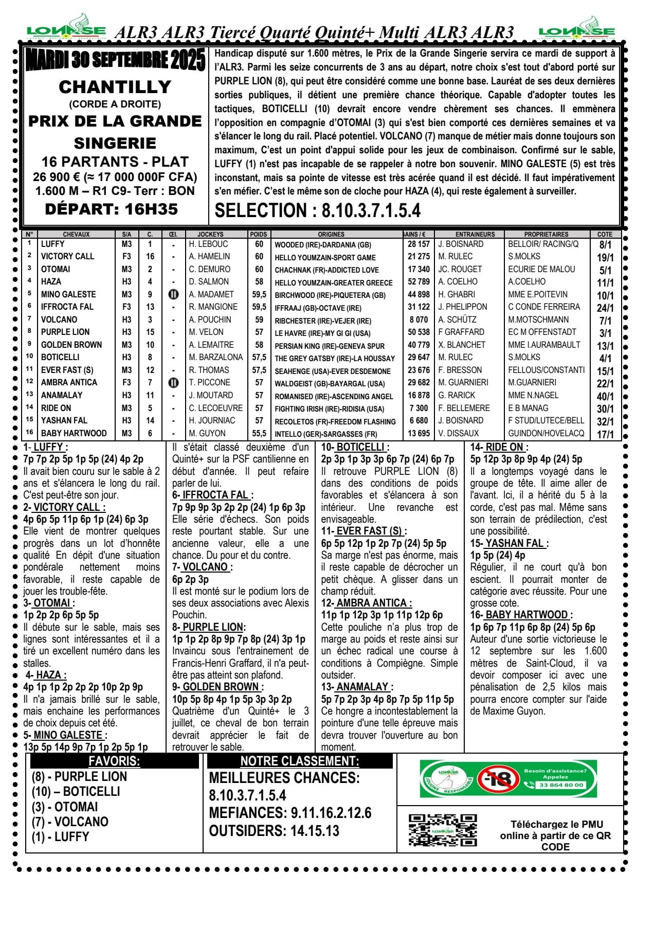Arrivé, gain, programme et pronostic de alr3 du jour 03-10-2025 LONASE