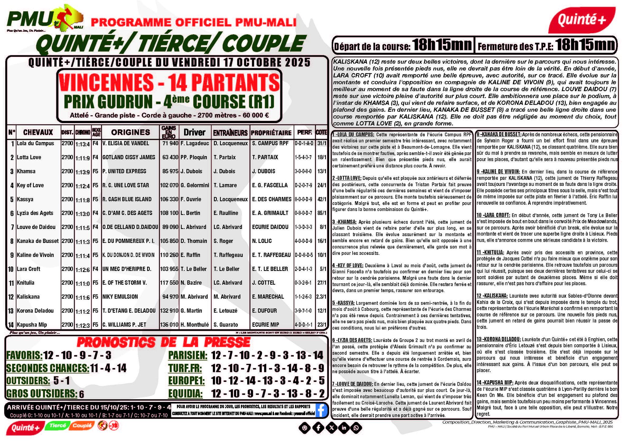 LES DETAILS, JOURNAUX DU PMU MALI DU 17-10-2025
