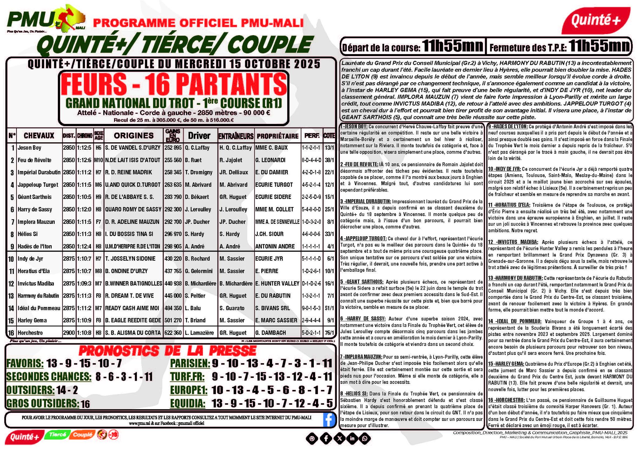 Journal hippique du quinté - pmu mali du 15-10-2025