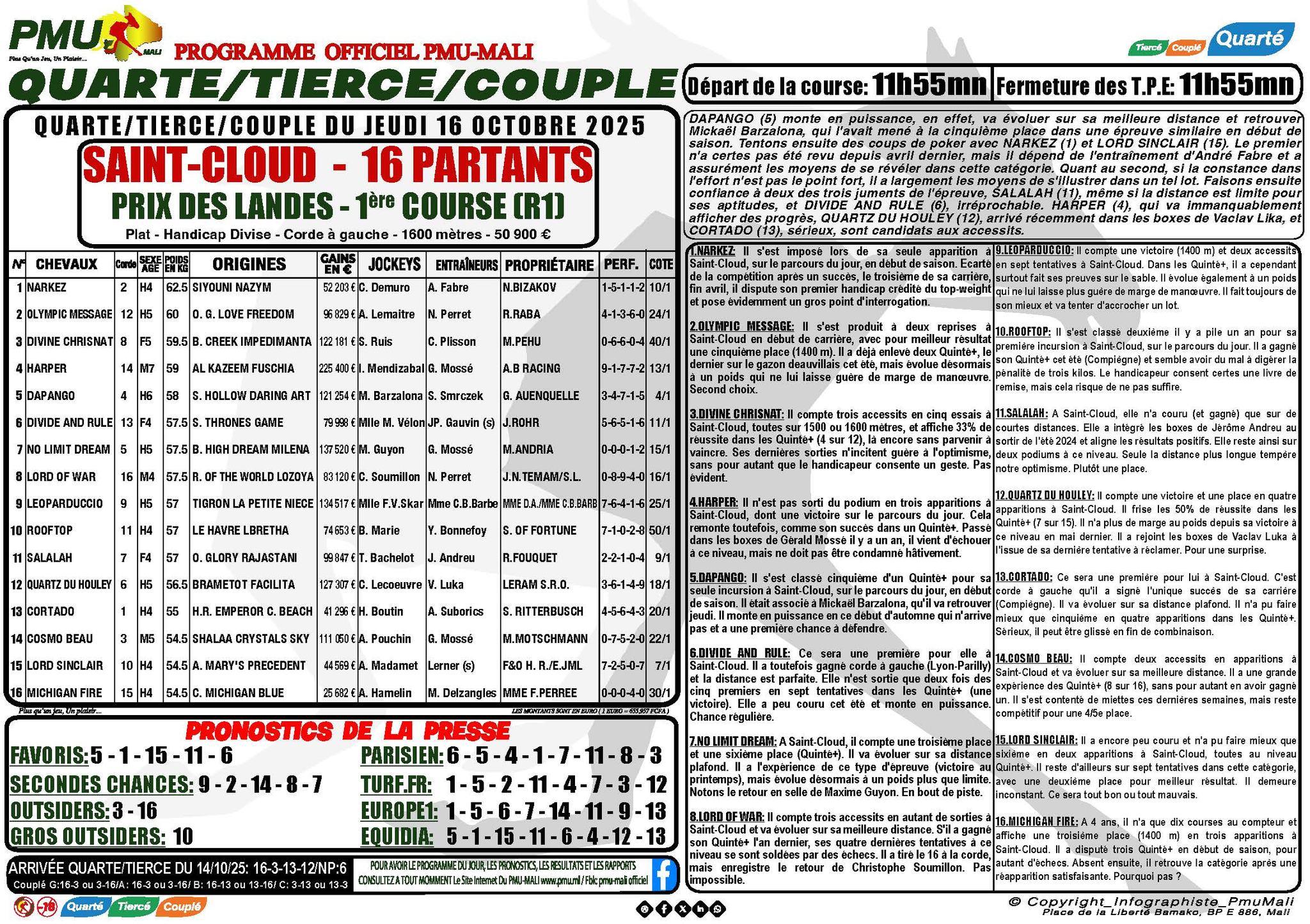 LES DETAILS, JOURNAUX DU PMU MALI DU 16-10-2025