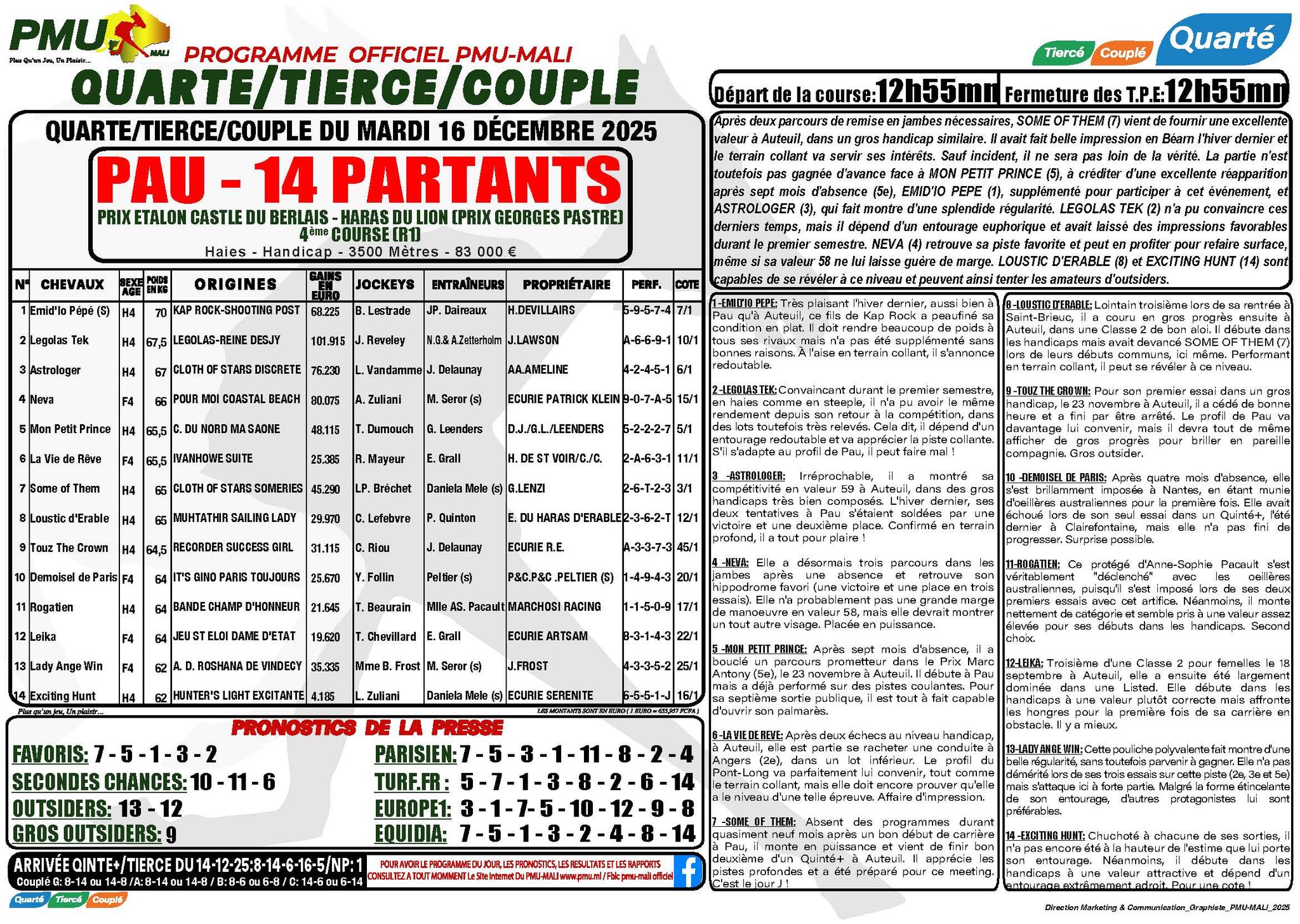 Journal hippique du quinté - pmu mali du 14-12-2025