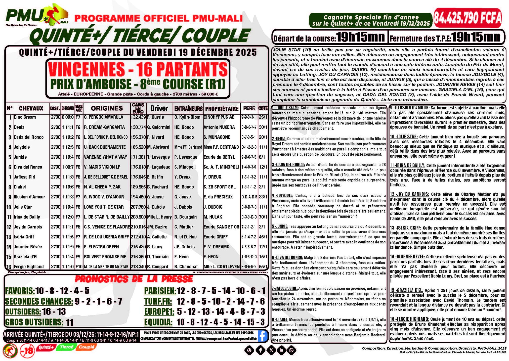 Journal hippique du quinté - pmu mali du 19-12-2025